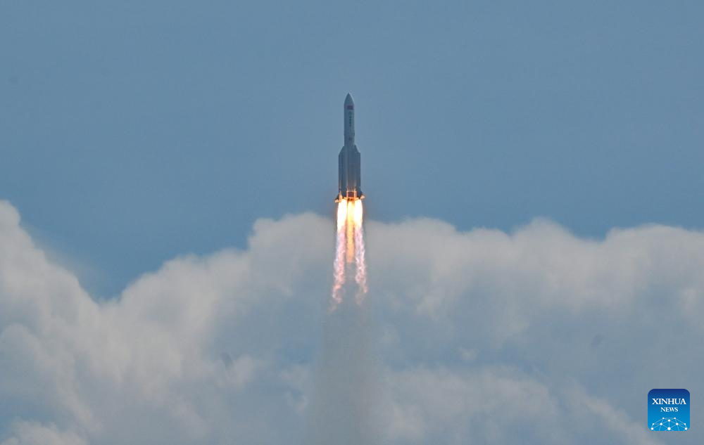Un cohete portador Gran Marcha-5B que transporta un grupo de satélites de órbita terrestre baja despega desde el Sitio de Lanzamiento Espacial de Wenchang, en la provincia de Hainan, en el sur de China, el 13 de agosto de 2025. Este grupo, el octavo de su tipo que constituirá una constelación de internet, fue lanzado a las 14:43 (hora de Beijing) a bordo de un cohete portador Gran Marcha-5B, el cual presentaba un componente superior Yuanzheng-2 (Expedición-2) en su parte superior. (Xinhua/Du Xinxin)