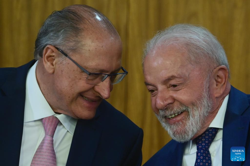 BRASILIA, 13 agosto, 2025 (Xinhua) -- El presidente brasileño, Luiz Inácio Lula da Silva (d), conversa con el vicepresidente brasileño, Geraldo Alckmin (i), durante la ceremonia de lanzamiento del Plan Brasil Soberano, en el Palacio de Planalto, en Brasilia, Brasil, el 13 de agosto de 2025. El Gobierno federal lanzó el miércoles el Plan Brasil Soberano, un paquete de medidas para apoyar a los sectores productivos afectado por el arancel del 50 por ciento impuesto por el Gobierno de Estados Unidos. (Xinhua/Lucio Tavora)