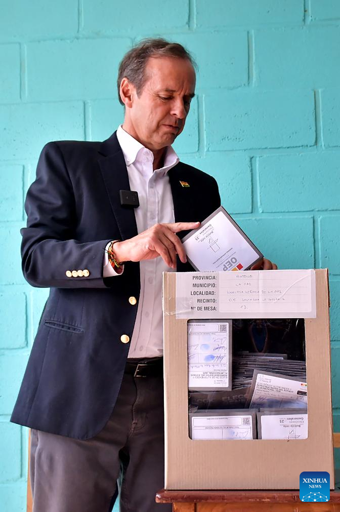 El candidato a la Presidencia de Bolivia, Jorge "Tuto" Quiroga, emite su voto durante las elecciones generales, en la unidad educativa Santa Rosa la Florida, en la ciudad de La Paz, Bolivia, el 17 de agosto de 2025. Las mesas electorales cerraron el domingo en Bolivia, tras ocho horas de jornada de votación en las elecciones generales e inició el conteo de votos en cada recinto con la participación de jurados y delegados políticos, confirmó el presidente del Tribunal Supremo Electoral (TSE), Oscar Hassenteufel. (Xinhua/Daniel Miranda)