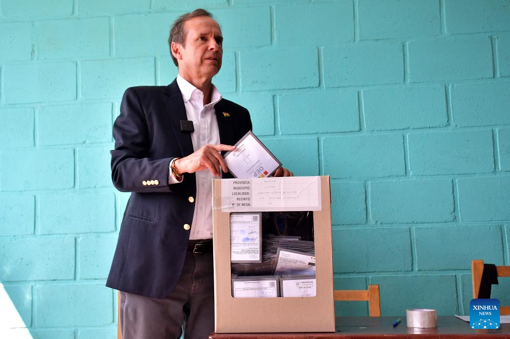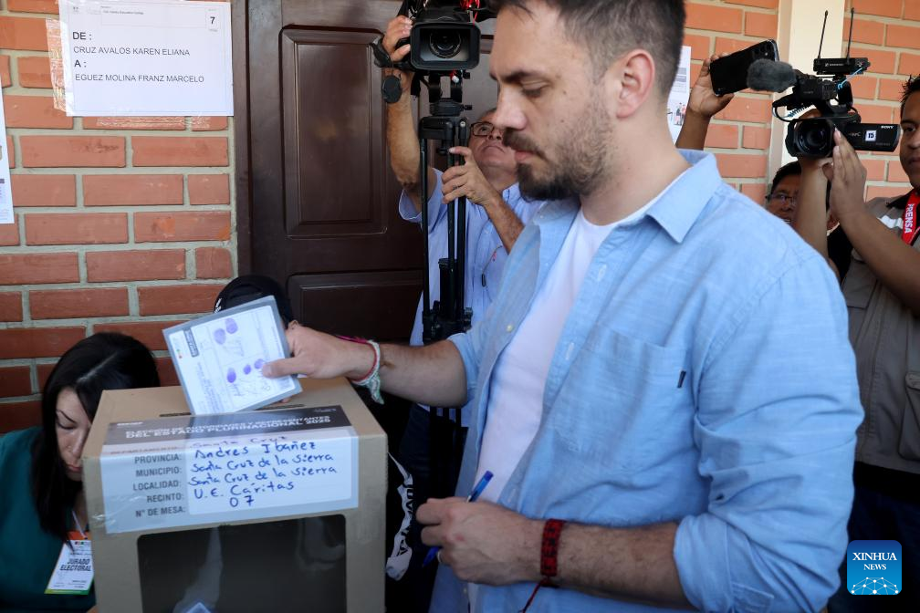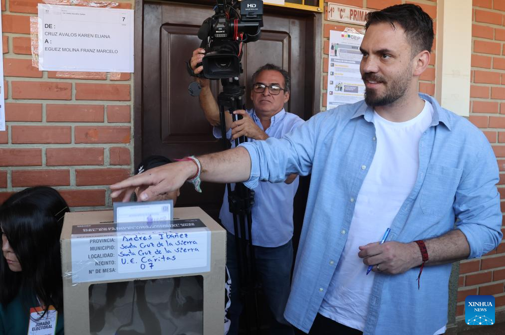 El candidato a la Presidencia de Bolivia, Eduardo del Castillo (frente), deposita su voto en una urna electoral durante las elecciones generales, en una unidad educativa, en la ciudad de Santa Cruz, Bolivia, el 17 de agosto de 2025. Las mesas electorales cerraron el domingo en Bolivia, tras ocho horas de jornada de votación en las elecciones generales e inició el conteo de votos en cada recinto con la participación de jurados y delegados políticos, confirmó el presidente del Tribunal Supremo Electoral (TSE), Oscar Hassenteufel. (Xinhua/Enrique Canedo)