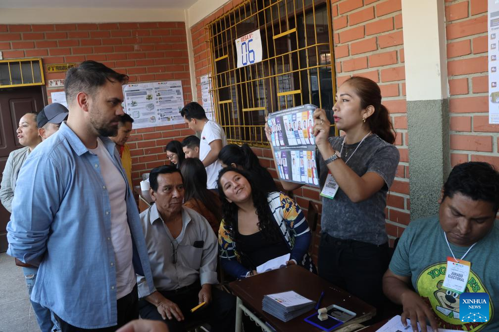 El candidato a la Presidencia de Bolivia, Eduardo del Castillo (i), se registra para emitir su voto durante las elecciones generales, en una unidad educativa, en la ciudad de Santa Cruz, Bolivia, el 17 de agosto de 2025. Las mesas electorales cerraron el domingo en Bolivia, tras ocho horas de jornada de votación en las elecciones generales e inició el conteo de votos en cada recinto con la participación de jurados y delegados políticos, confirmó el presidente del Tribunal Supremo Electoral (TSE), Oscar Hassenteufel. (Xinhua/Enrique Canedo)