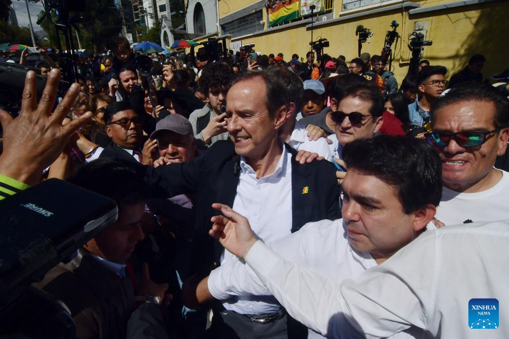 El candidato a la Presidencia de Bolivia, Jorge "Tuto" Quiroga (c), llega a emitir su voto durante las elecciones generales, en la unidad educativa Santa Rosa la Florida, en la ciudad de La Paz, Bolivia, el 17 de agosto de 2025. Las mesas electorales cerraron el domingo en Bolivia, tras ocho horas de jornada de votación en las elecciones generales e inició el conteo de votos en cada recinto con la participación de jurados y delegados políticos, confirmó el presidente del Tribunal Supremo Electoral (TSE), Oscar Hassenteufel. (Xinhua/Daniel Miranda)