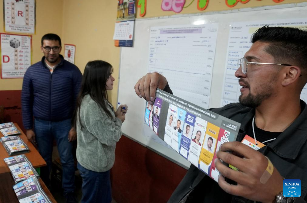 Un funcionario electoral (i), muestra una boleta electoral, mientras se realiza el conteo de votos al término de las elecciones generales, en una unidad educativa, en la ciudad de La Paz, Bolivia, el 17 de agosto de 2025. Las mesas electorales cerraron el domingo en Bolivia, tras ocho horas de jornada de votación en las elecciones generales e inició el conteo de votos en cada recinto con la participación de jurados y delegados políticos, confirmó el presidente del Tribunal Supremo Electoral (TSE), Oscar Hassenteufel. (Xinhua/Javier Mamani)