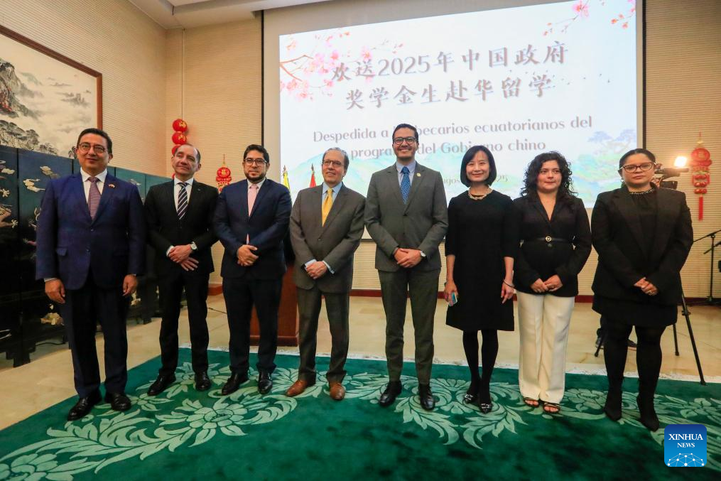 Imagen del 21 de agosto de 2025 del titular de la Secretaría de Educación Superior, Ciencia, Tecnología e Innovación ecuatoriano, César Vásquez (4-d), la encargada de Negocios interina de la Embajada de China en Ecuador, Wei Lin (3-d), y la becaria, Andrea Argoti (2-d), posando para una fotografía durante una despedida en honor a los becarios ecuatorianos previa a su viaje a China, en la ciudad de Quito, capital de Ecuador. Un grupo de 40 estudiantes ecuatorianos accedió a becas para estudios de educación superior de tercer y cuarto nivel, así como para estudiar el idioma chino, ofertadas por el Gobierno de China dentro de un programa de cooperación con el país sudamericano, informó Wei. (Xinhua/Ricardo Landeta)