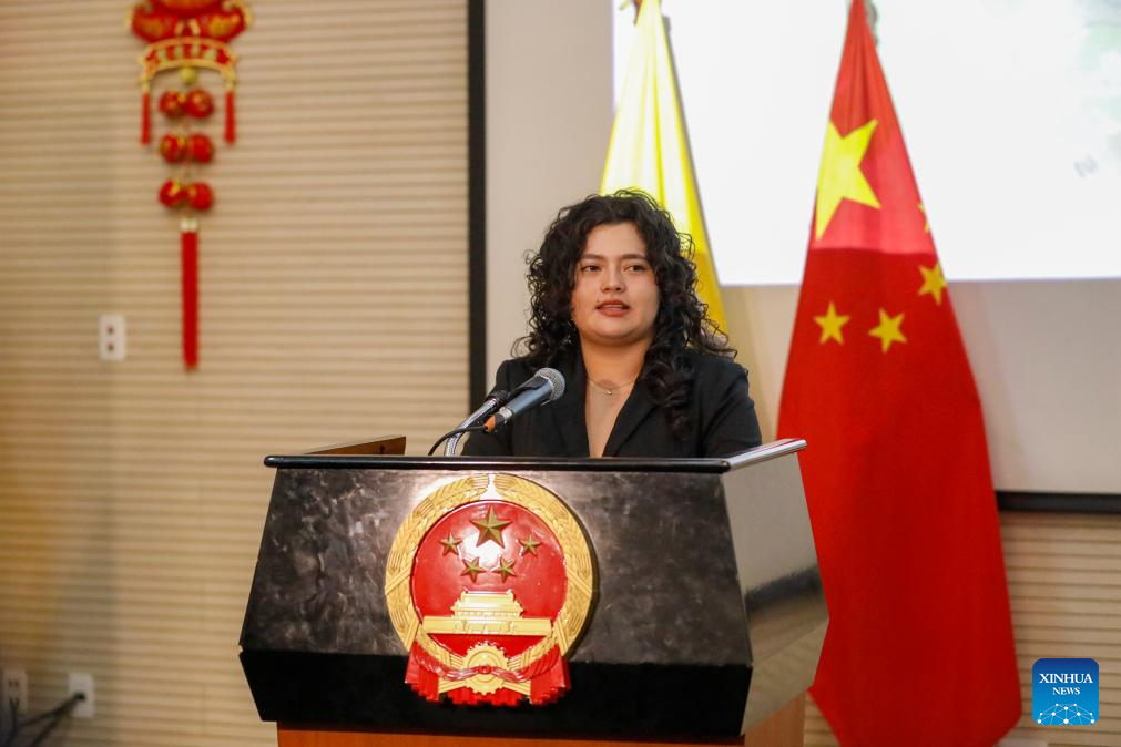 Imagen del 21 de agosto de 2025 de la becaria, Andrea Argoti, hablando durante una despedida en honor a los becarios ecuatorianos previa a su viaje a China, en la ciudad de Quito, capital de Ecuador. Un grupo de 40 estudiantes ecuatorianos accedió a becas para estudios de educación superior de tercer y cuarto nivel, así como para estudiar el idioma chino, ofertadas por el Gobierno de China dentro de un programa de cooperación con el país sudamericano, informó la encargada de Negocios interina de la Embajada de China en Ecuador, Wei Lin. (Xinhua/Ricardo Landeta)