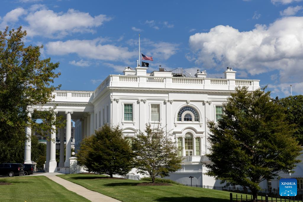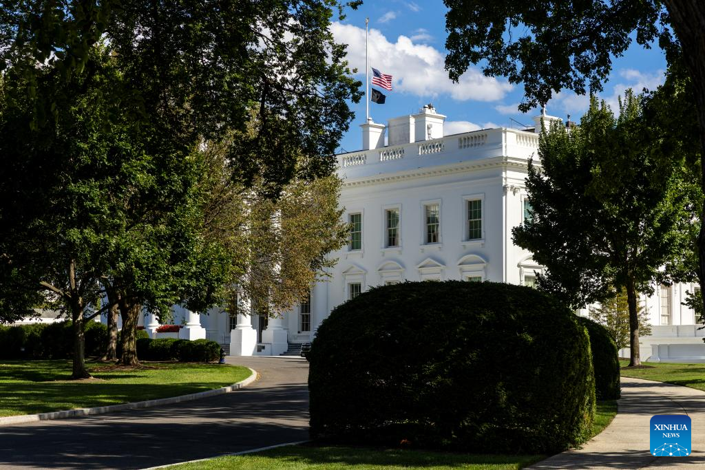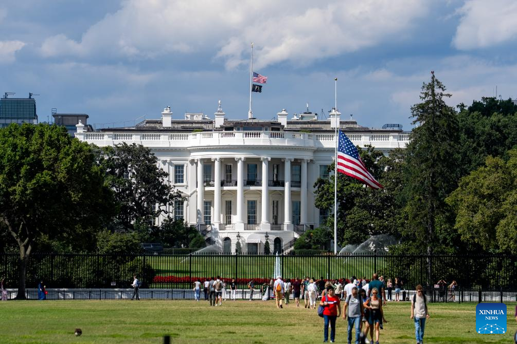 La bandera estadounidense ondea a media asta en la Casa Blanca, en Washington D.C., Estados Unidos, el 27 de agosto de 2025. Un tiroteo ocurrido el miércoles por la mañana en la Escuela Católica de la Anunciación en la ciudad de Minneapolis, en el estado estadounidense de Minnesota, provocó la muerte de dos niños, uno de 8 años y otro de 10, además de lesionar a 17 personas más, confirmó la Policía. Horas después del tiroteo, el presidente de Estados Unidos, Donald Trump, firmó un decreto para izar las banderas a media asta en honor a las víctimas. (Xinhua/Hu Yousong