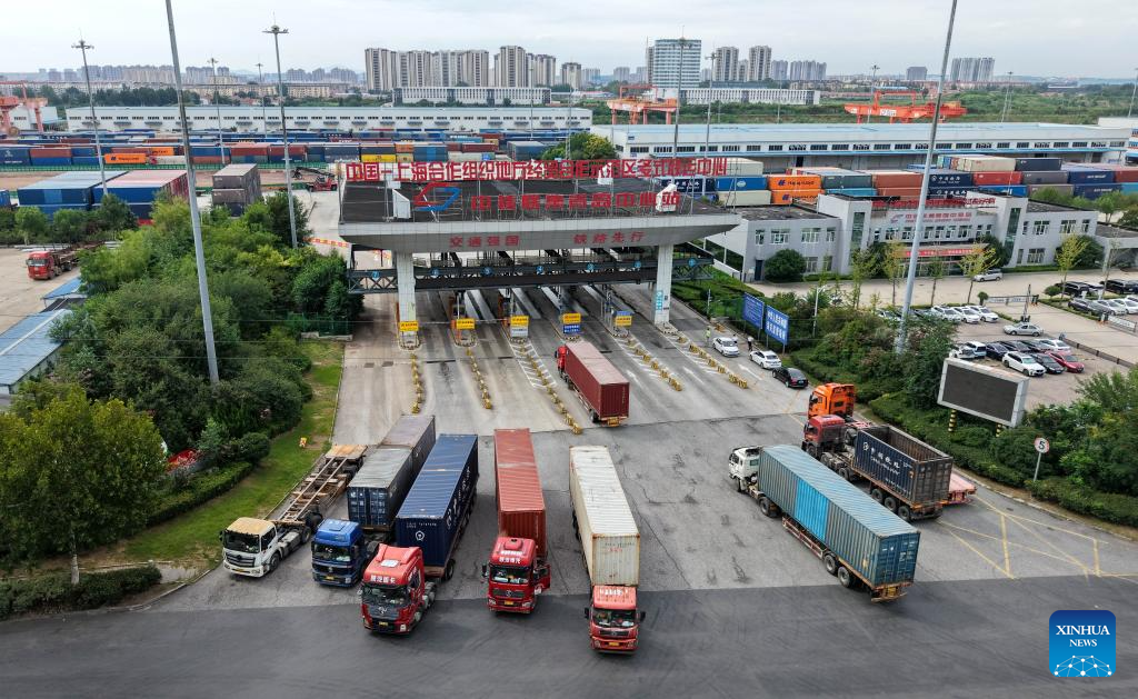 QINGDAO, 29 agosto, 2025 (Xinhua) -- Imagen tomada con un dron el 27 de agosto de 2025 de camiones transportando mercancías en el centro de transporte multimodal del la Zona de Demostración de Cooperación Económica y Comercial Local China-OCS (Organización de Cooperación de Shanghai) (SCODA), en Qingdao, en la provincia de Shandong, en el este de China. De acuerdo con las estadísticas de las aduanas, el valor comercial de la zona de demostración con otros países miembros de la OCS durante los primeros siete meses de este año alcanzó los 53,26 billones de yuanes (unos 7,47 billones de dólares estadounidenses), lo que supone un aumento interanual del 26,1 por ciento. (Xinhua/Li Ziheng)