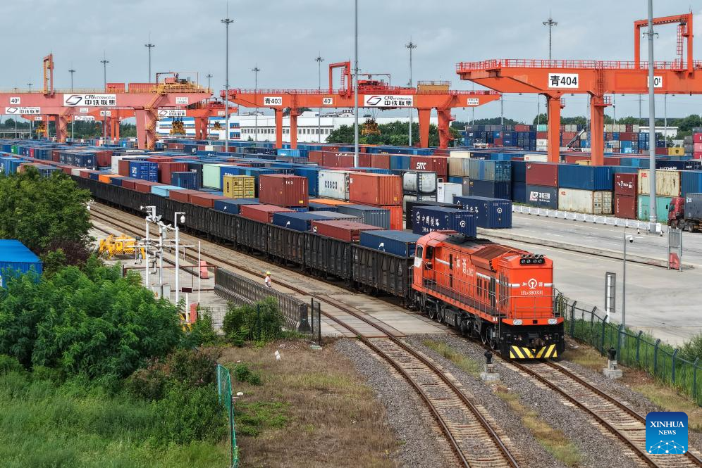 QINGDAO, 29 agosto, 2025 (Xinhua) -- Imagen tomada con un dron el 27 de agosto de 2025 de un tren de carga llegando al centro de transporte multimodal de la Zona de Demostración de Cooperación Económica y Comercial Local China-OCS (Organización de Cooperación de Shanghai) (SCODA), en Qingdao, en la provincia de Shandong, en el este de China. De acuerdo con las estadísticas de las aduanas, el valor comercial de la zona de demostración con otros países miembros de la OCS durante los primeros siete meses de este año alcanzó los 53,26 billones de yuanes (unos 7,47 billones de dólares estadounidenses), lo que supone un aumento interanual del 26,1 por ciento. (Xinhua/Li Ziheng)
