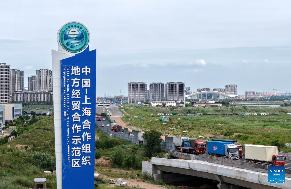 QINGDAO, 29 agosto, 2025 (Xinhua) -- Imagen tomada con un dron el 27 de agosto de 2025 de camiones transportando mercancías por una carretera en la Zona de Demostración de Cooperación Económica y Comercial Local China-OCS (Organización de Cooperación de Shanghai) (SCODA), en Qingdao, en la provincia de Shandong, en el este de China. De acuerdo con las estadísticas de las aduanas, el valor comercial de la zona de demostración con otros países miembros de la OCS durante los primeros siete meses de este año alcanzó los 53,26 billones de yuanes (unos 7,47 billones de dólares estadounidenses), lo que supone un aumento interanual del 26,1 por ciento. (Xinhua/Li Ziheng)