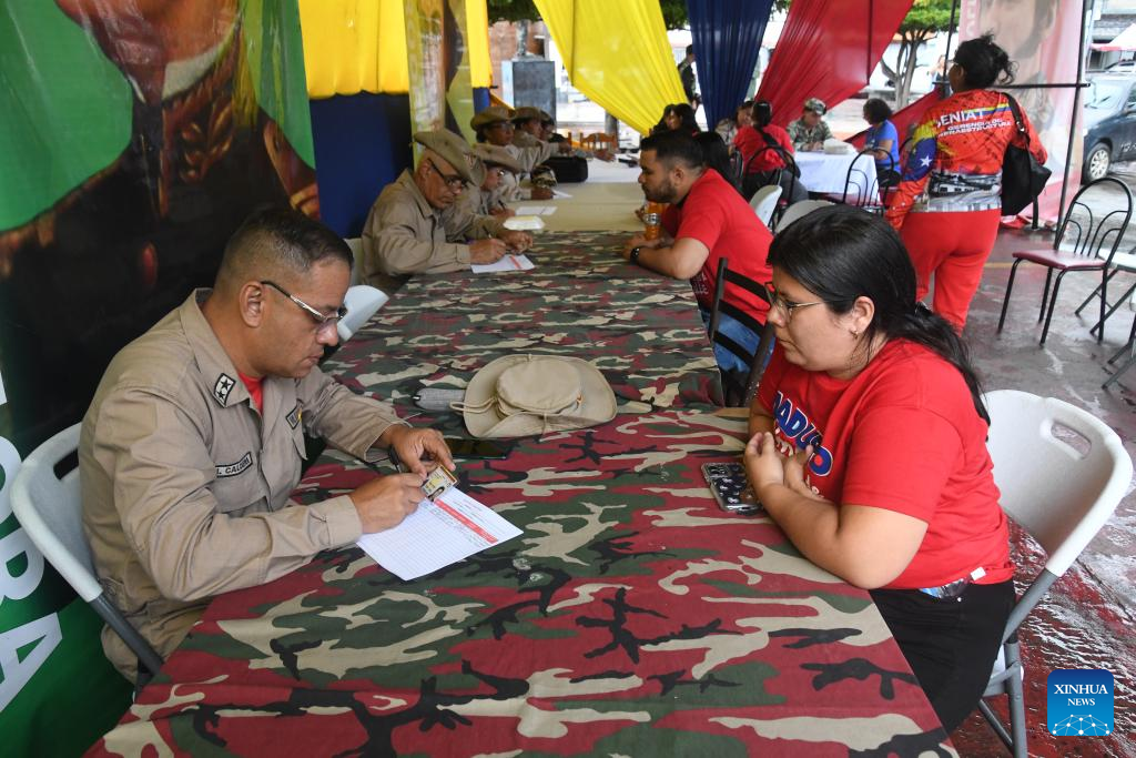 Personas se alistan en la Milicia Nacional Bolivariana durante la segunda jornada de alistamiento, en Caracas, Venezuela, el 29 de agosto de 2025. Es con la "unión nacional" que se podrá hacer frente a "la agresión militar" que plantea el imperialismo norteamericano sobre Venezuela, afirmó el viernes el ministro del Poder Popular para la Defensa venezolano, Vladimir Padrino López. (Xinhua/Marcos Salgado)