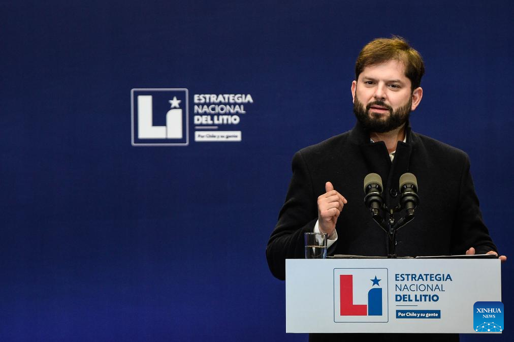 Imagen del 5 de septiembre de 2025 del presidente chileno, Gabriel Boric, pronunciando un discurso durante la firma del primer Contrato Especial de Operación de Litio (CEOL) con la Empresa Nacional de Minería (Enami) para el proyecto Salares Altoandinos, en el Palacio de La Moneda, en Santiago, capital de Chile. Chile firmó el viernes el primer CEOL con Enami que permitirá la explotación del proyecto Salares Altoandinos, en la región de Atacama, uno de los más importantes en América Latina. (Xinhua/Jorge Villegas)