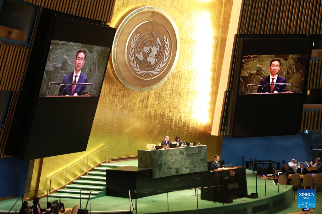 Geng Shuang, encargado de negocios de la Misión Permanente de China ante las Naciones Unidas, presenta el borrador de resolución a la Asamblea General en la sede de la ONU, en Nueva York, el 5 de septiembre de 2025. La Asamblea General de la ONU adoptó el viernes por amplia mayoría una resolución sobre colaboración entre las Naciones Unidas y la Organización de Cooperación de Shanghai (OCS). La resolución, presentada por China y copatrocinada por casi 40 países, incluidos todos los Estados miembros de la OCS, elogia el rol constructivo de la OCS en promover la paz, el desarrollo, la confianza mutua y la cooperación regionales. (Xinhua/Xie E)