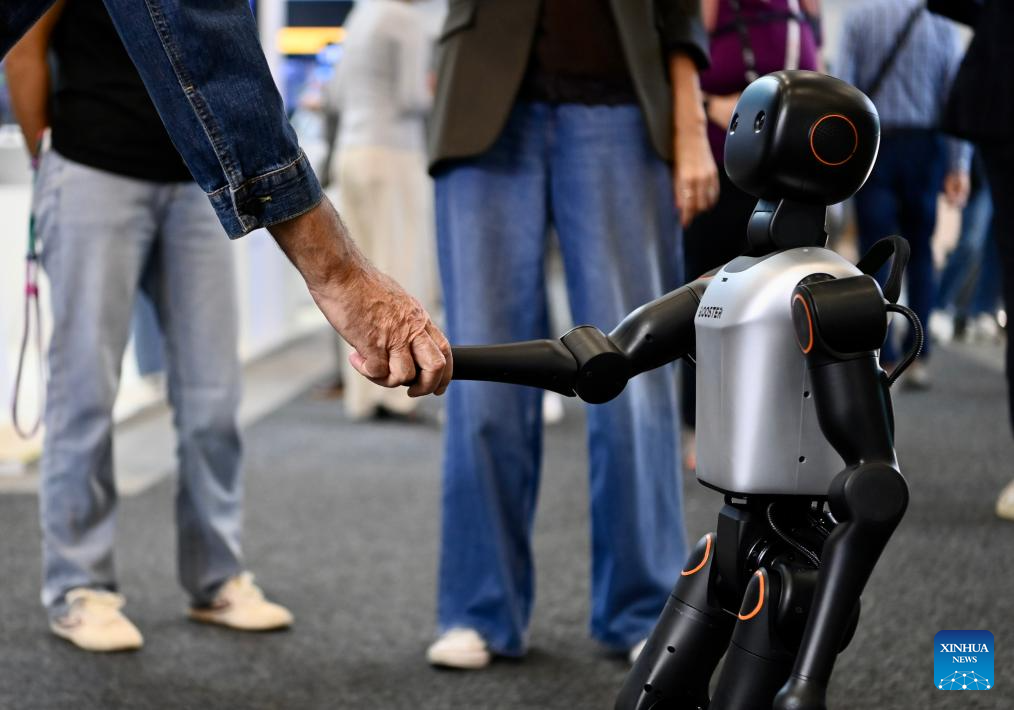 BERLIN, 6 septiembre, 2025 (Xinhua) -- Imagen del 5 de septiembre de 2025 de un visitante estrechando la mano de un robot humanoide en la IFA Berlín 2025, en Berlín, Alemania. La IFA Berlín 2025, una de las ferias comerciales más grandes del mundo dedicada a la electrónica de consumo y los electrodomésticos, abrió el viernes, enfocándose en temas orientados al futuro como la tecnología de la información, la inteligencia artificial, el software y la potencia informática, así como soluciones sostenibles para el hogar, la movilidad y el estilo de vida. (Xinhua/Zhang Haofu)