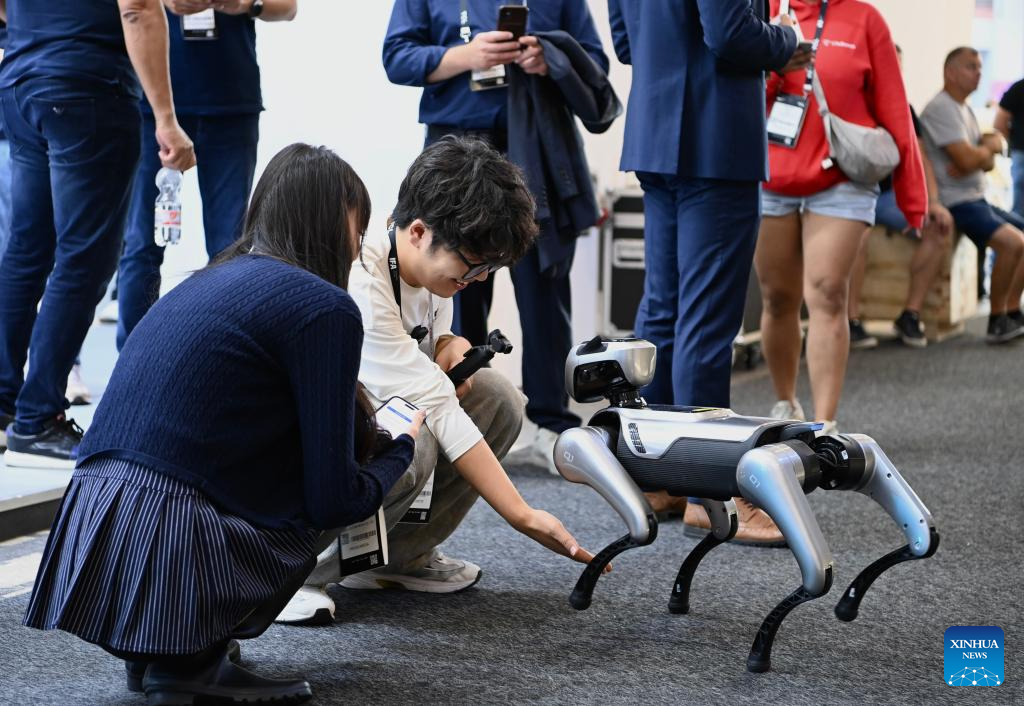 BERLIN, 6 septiembre, 2025 (Xinhua) -- Imagen del 5 de septiembre de 2025 de personas interactuando con un perro robot en la IFA Berlín 2025, en Berlín, Alemania. La IFA Berlín 2025, una de las ferias comerciales más grandes del mundo dedicada a la electrónica de consumo y los electrodomésticos, abrió el viernes, enfocándose en temas orientados al futuro como la tecnología de la información, la inteligencia artificial, el software y la potencia informática, así como soluciones sostenibles para el hogar, la movilidad y el estilo de vida. (Xinhua/Zhang Haofu)