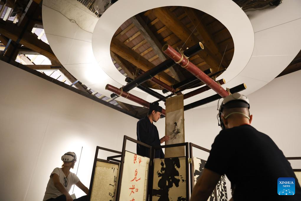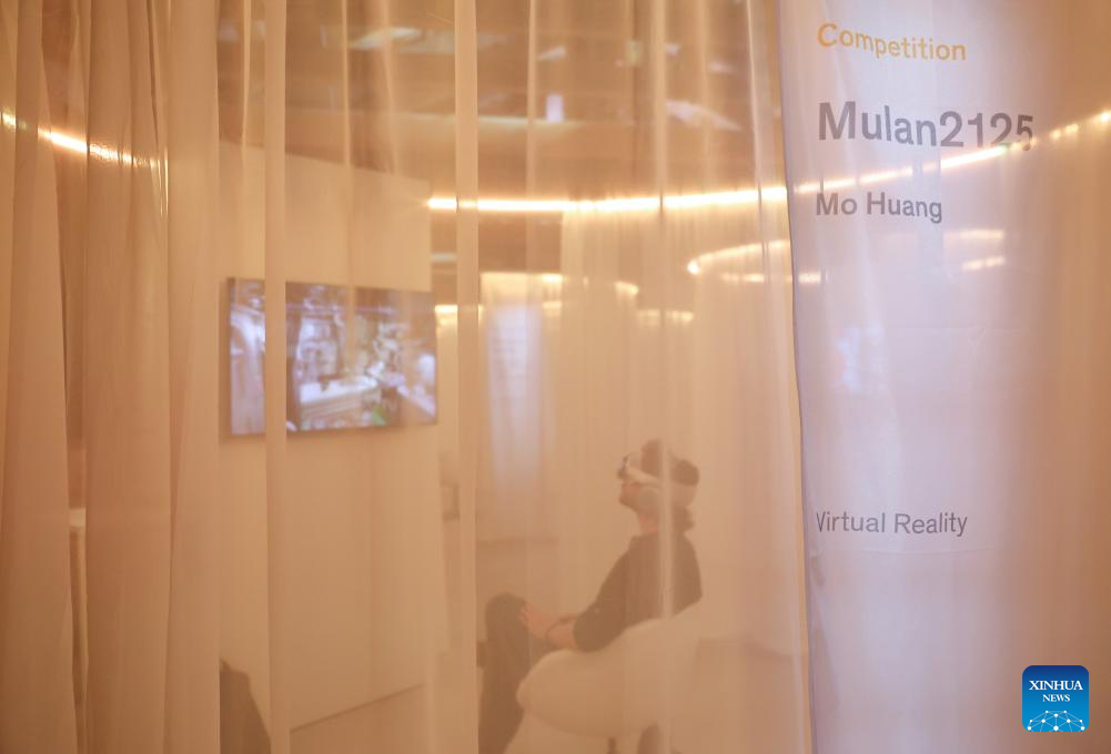 VENECIA, 6 septiembre, 2025 (Xinhua) -- Imagen del 4 de septiembre de 2025 de un visitante experimentando la película Mulan2125 en el área de proyección de la sección Venecia Inmersiva del 82º Festival de Cine de Venecia, en Venecia, Italia. (Xinhua/Li Jing)
