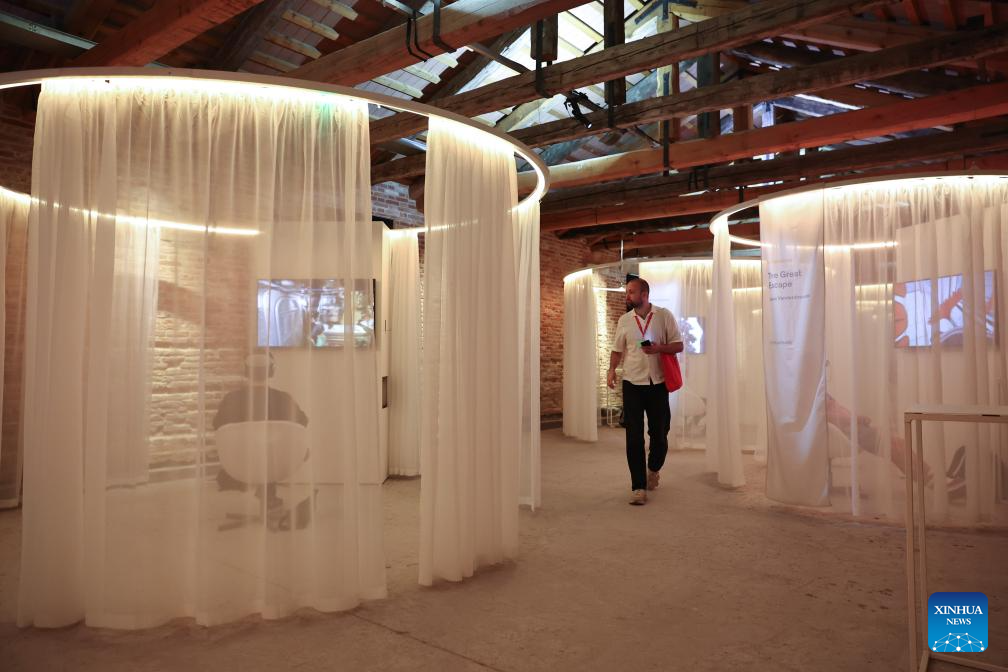 VENECIA, 6 septiembre, 2025 (Xinhua) -- Imagen del 4 de septiembre de 2025 de un visitante caminando frente al área de proyección de la sección Venecia Inmersiva del 82º Festival de Cine de Venecia, en Venecia, Italia. (Xinhua/Li Jing)