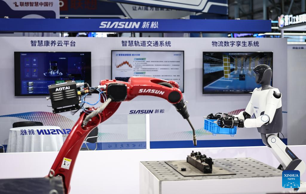 SHENYANG, 7 septiembre, 2025 (Xinhua) -- Imagen del 6 de septiembre de 2025 de robots industriales exhibidos en el área de exposiciones de la Conferencia Global de Internet Industrial 2025, en Shenyang, en la provincia de Liaoning, en el noreste de China. Con el lema "Nuevo Capítulo Digital, Nueva Calidad Inteligente", la Conferencia Global de Internet Industrial 2025 comenzó aquí el sábado y durará hasta el 8 de septiembre. (Xinhua/Pan Yulong)