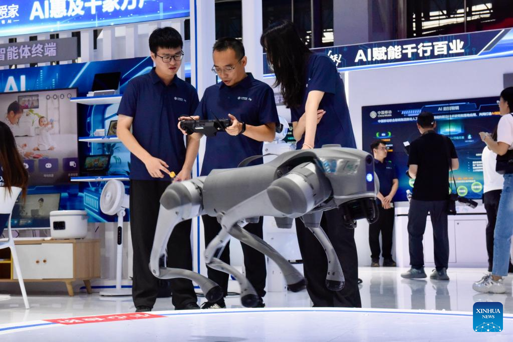SHENYANG, 7 septiembre, 2025 (Xinhua) -- Empleados de China Mobile ajustan un perro robótico en el área de exposiciones de la Conferencia Global de Internet Industrial 2025, en Shenyang, en la provincia de Liaoning, en el noreste de China, el 7 de septiembre de 2025. Con el lema "Nuevo Capítulo Digital, Nueva Calidad Inteligente", la Conferencia Global de Internet Industrial 2025 comenzó aquí el sábado y durará hasta el 8 de septiembre. (Xinhua/Wang Yuyan)