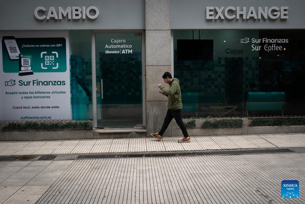 Un hombre camina frente a un local de intercambio de divisas, en la ciudad de Buenos Aires, capital de Argentina, el 8 de septiembre de 2025. Los valores del peso argentino, junto a las acciones y los títulos públicos del país, reportaron el lunes fuertes caídas, tras el revés electoral que tuvo el partido gobernante en las elecciones legislativas realizadas el domingo en la provincia de Buenos Aires. (Xinhua/Martín Zabala)