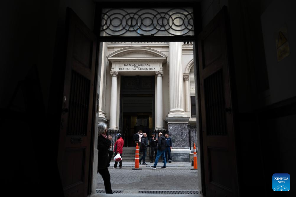 BUENOS AIRES, 8 septiembre, 2025 (Xinhua) -- Personas caminan frente a la sede del Banco Central de la República Argentina, en la ciudad de Buenos Aires, capital de Argentina, el 8 de septiembre de 2025. Los valores del peso argentino, junto a las acciones y los títulos públicos del país, reportaron el lunes fuertes caídas, tras el revés electoral que tuvo el partido gobernante en las elecciones legislativas realizadas el domingo en la provincia de Buenos Aires. (Xinhua/Martín Zabala)