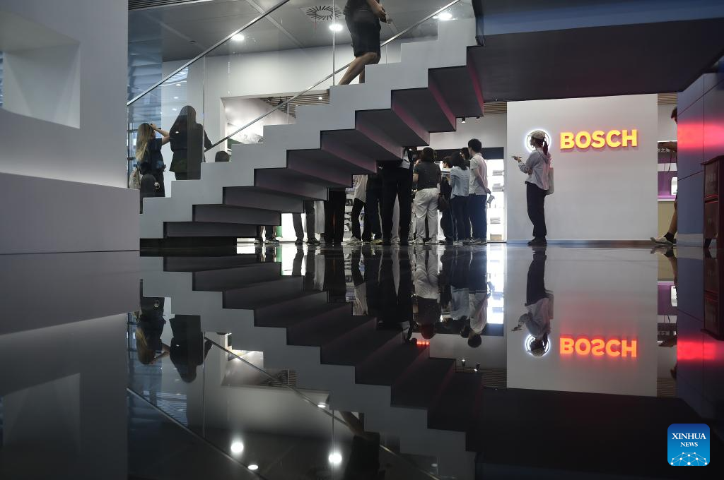 SHANGHAI, 11 septiembre, 2025 (Xinhua) -- Imagen del 10 de septiembre de 2025 de personas visitando una sala de exposiciones de Bosch en la Zona Económica del Aeropuerto Hongqiao de Shanghai, en Shanghai, en el este de China. Cubriendo un área de 13,89 kilómetros cuadrados, la Zona Económica del Aeropuerto Hongqiao de Shanghai, la primera zona económica de aeropuerto a nivel nacional en el delta del río Yangtse, actualmente ha reunido a más de 4.000 empresas, de las cuales aproximadamente una cuarta parte son empresas con capital extranjero. (Xinhua/Lu Peng)