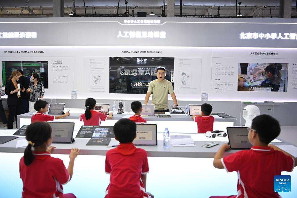 BEIJING, 11 septiembre, 2025 (Xinhua) -- Estudiantes tienen una clase en un aula interactiva de inteligencia artificial en la Feria Internacional de Comercio de Servicios de China (CIFTIS, por sus siglas en inglés) 2025, en Beijing, capital de China, el 11 de septiembre de 2025. La CIFTIS 2025 abrió sus puertas el miércoles en Beijing bajo el tema "Abrazar tecnologías inteligentes, impulsar el comercio de servicios". (Xinhua/Xiao Xiao)