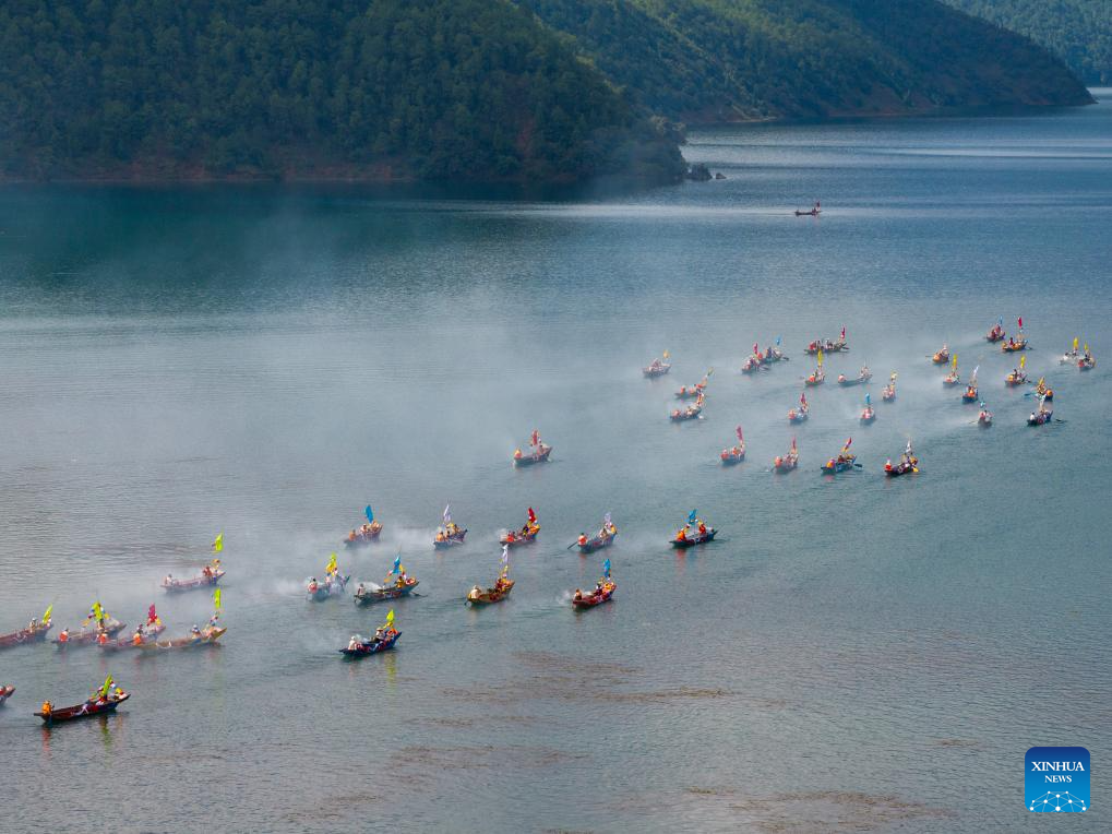LIANGSHAN, 16 septiembre, 2025 (Xinhua) -- Vista aérea tomada con un dron el 16 de septiembre de 2025 de residentes dando vuelta alrededor del lago en bote, en el distrito de Yanyuan de la prefectura autónoma yi de Liangshan, en la provincia de Sichuan, en el suroeste de China. La vuelta a la montaña y al lago es una importante costumbre popular del pueblo mosuo que vive cerca del lago Lugu. (Xinhua/Jiang Hongjing)