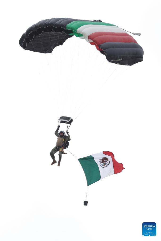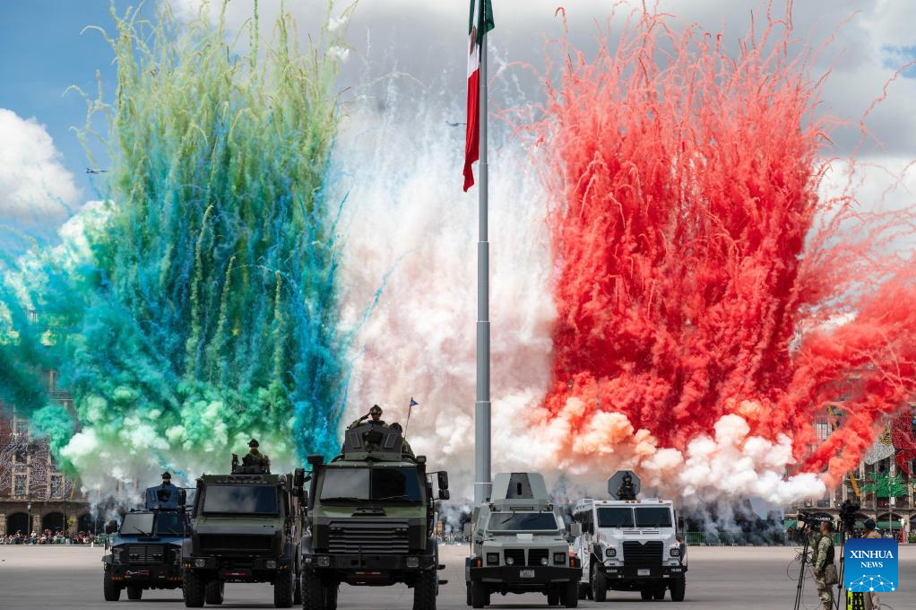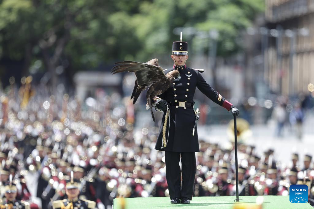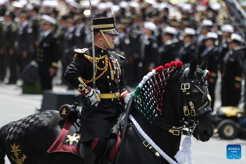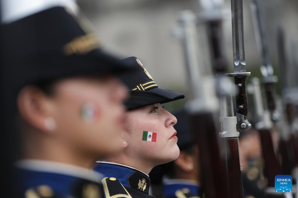 MÉXICO, 16 sep (Xinhua) -- México celebró hoy martes el aniversario 215 del inicio de la lucha independentista contra el colonialismo español con la realización del tradicional Desfile Cívico Militar en la Ciudad de México, con la particularidad de que por primera ocasión se presentaron honores y se rindió el parte de novedades a una mujer, Claudia Sheinbaum, primera presidenta y comandanta suprema de las Fuerzas Armadas del país latinoamericano.