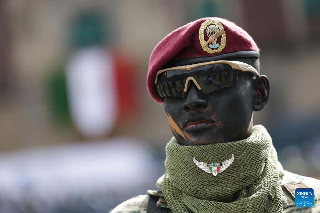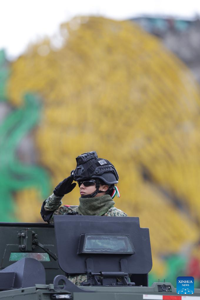 CIUDAD DE MEXICO, 16 septiembre, 2025 (Xinhua) -- Un elemento del Ejército mexicano participa en el Desfile Cívico Militar en conmemoración del 215 aniversario de la Independencia de México, en la Ciudad de México, capital de México, el 16 de septiembre de 2025. México celebró el martes el aniversario 215 del inicio de la lucha independentista contra el colonialismo español con la realización del tradicional Desfile Cívico Militar en la Ciudad de México, con la particularidad de que por primera ocasión se presentaron honores y se rindió el parte de novedades a una mujer, Claudia Sheinbaum, primera presidenta y comandanta suprema de las Fuerzas Armadas del país latinoamericano. (Xinhua/Francisco Cañedo)