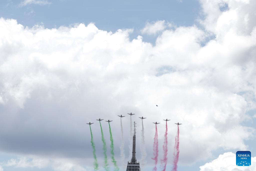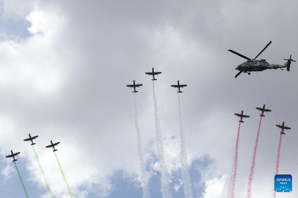 CIUDAD DE MEXICO, 16 septiembre, 2025 (Xinhua) -- Aviones militares vuelan en formación durante el Desfile Cívico Militar en conmemoración del 215 aniversario de la Independencia de México, en la Ciudad de México, capital de México, el 16 de septiembre de 2025. México celebró el martes el aniversario 215 del inicio de la lucha independentista contra el colonialismo español con la realización del tradicional Desfile Cívico Militar en la Ciudad de México, con la particularidad de que por primera ocasión se presentaron honores y se rindió el parte de novedades a una mujer, Claudia Sheinbaum, primera presidenta y comandanta suprema de las Fuerzas Armadas del país latinoamericano. (Xinhua/Francisco Cañedo)