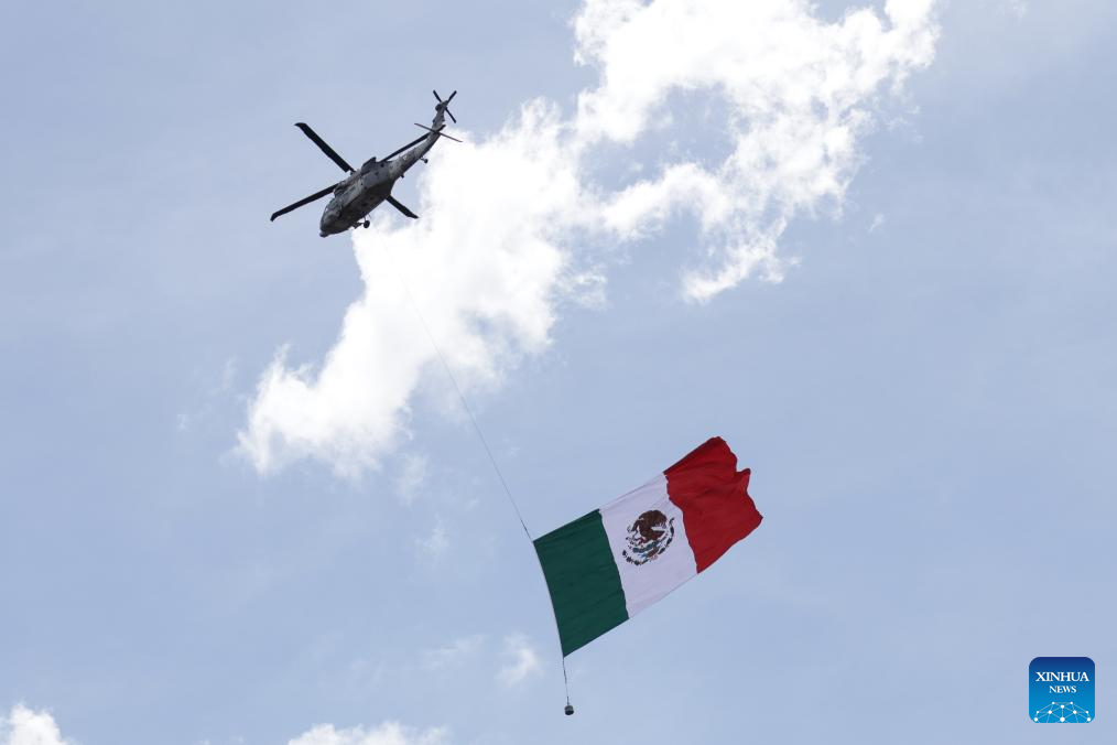 CIUDAD DE MEXICO, 16 septiembre, 2025 (Xinhua) -- Un helicóptero vuela durante el Desfile Cívico Militar en conmemoración del 215 aniversario de la Independencia de México, en la Ciudad de México, capital de México, el 16 de septiembre de 2025. México celebró el martes el aniversario 215 del inicio de la lucha independentista contra el colonialismo español con la realización del tradicional Desfile Cívico Militar en la Ciudad de México, con la particularidad de que por primera ocasión se presentaron honores y se rindió el parte de novedades a una mujer, Claudia Sheinbaum, primera presidenta y comandanta suprema de las Fuerzas Armadas del país latinoamericano. (Xinhua/Francisco Cañedo)