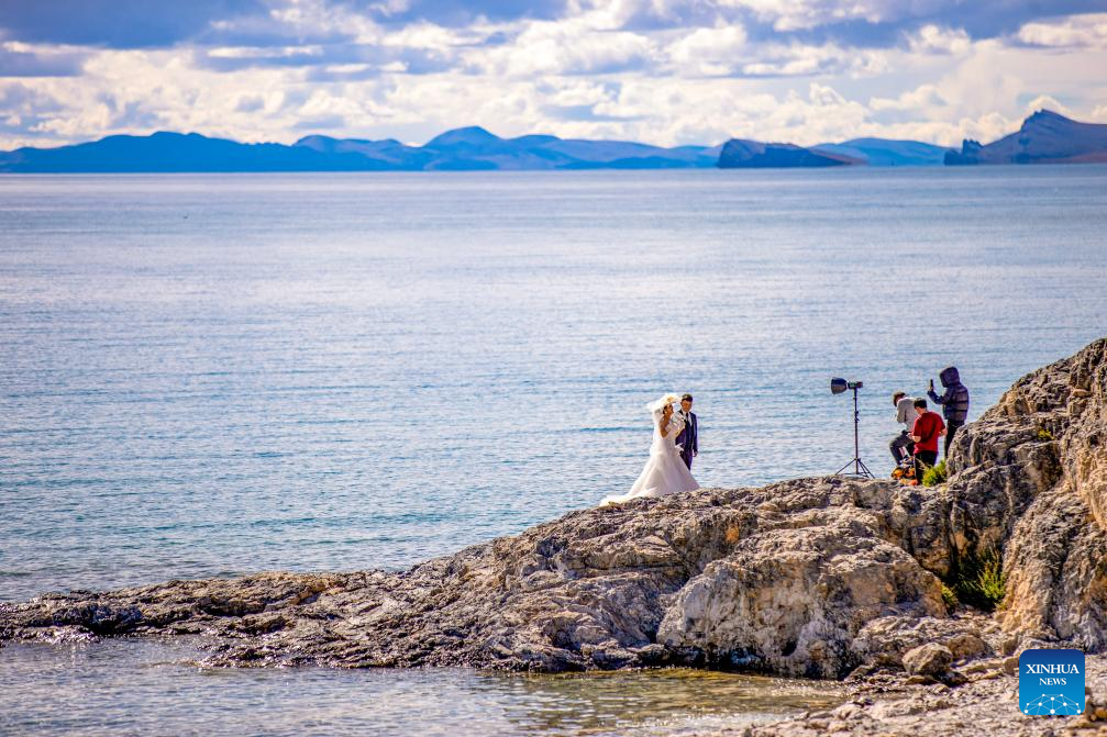 LHASA, 17 septiembre, 2025 (Xinhua) -- Imagen del 16 de septiembre de 2025 de turistas tomándose fotografías de boda junto al Nam Co, el lago de agua salada más alto del mundo, en la región autónoma de Xizang, en el suroeste de China. El Nam Co, situado en la meseta Qinghai-Xizang, con una altitud de 4.718 metros, es el segundo lago más grande de la región. (Xinhua/Jiang Fan)