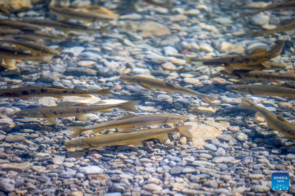 LHASA, 17 septiembre, 2025 (Xinhua) -- Imagen del 16 de septiembre de 2025 de carpas desnudas vistas en el Nam Co, el lago de agua salada más alto del mundo, en la región autónoma de Xizang, en el suroeste de China. El Nam Co, situado en la meseta Qinghai-Xizang, con una altitud de 4.718 metros, es el segundo lago más grande de la región. (Xinhua/Jiang Fan)