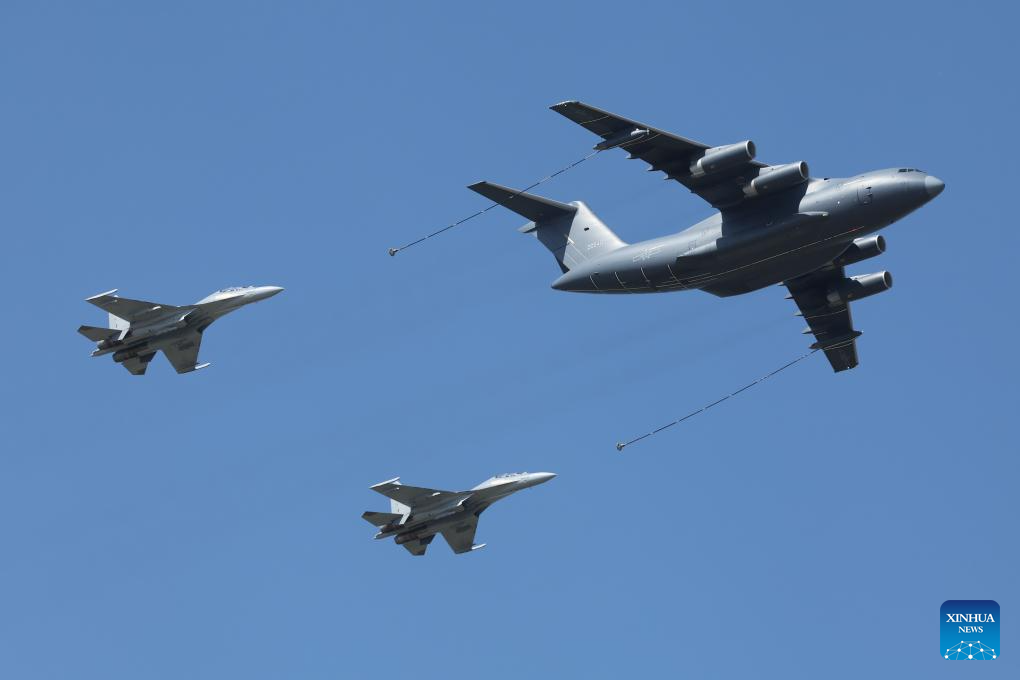 CHANGCHUN, 23 septiembre, 2025 (Xinhua) -- Un avión cisterna YY-20A y dos aviones de combate J-16 son vistos durante las actividades de la jornada de puertas abiertas de aviación 2025 de la Fuerza Aérea del Ejército Popular de Liberación de China y el Salón Aeronáutico de Changchun, en Changchun, en la provincia de Jilin, en el noreste de China, el 23 de septiembre de 2025. Los eventos concluyeron aquí el martes. (Xinhua/Tan Sicheng)