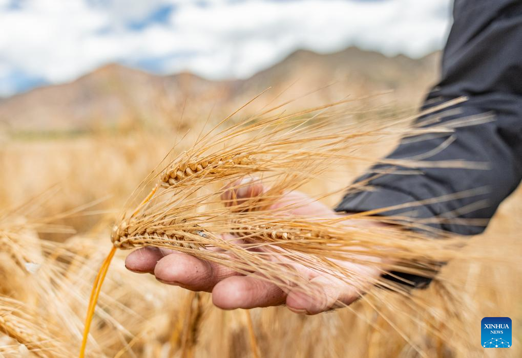 LHASA, 23 septiembre, 2025 (Xinhua) -- Imagen tomada el 23 de septiembre de 2025 de espigas de cebada de tierras altas, en el distrito de Lhunzhub, en Lhasa, en la región autónoma de Xizang, en el suroeste de China, el 23 de septiembre de 2025. El festival de la cosecha de los agricultores chinos es el primer festival nacional creado específicamente para los agricultores del país. (Xinhua/Tenzin Nyida)
