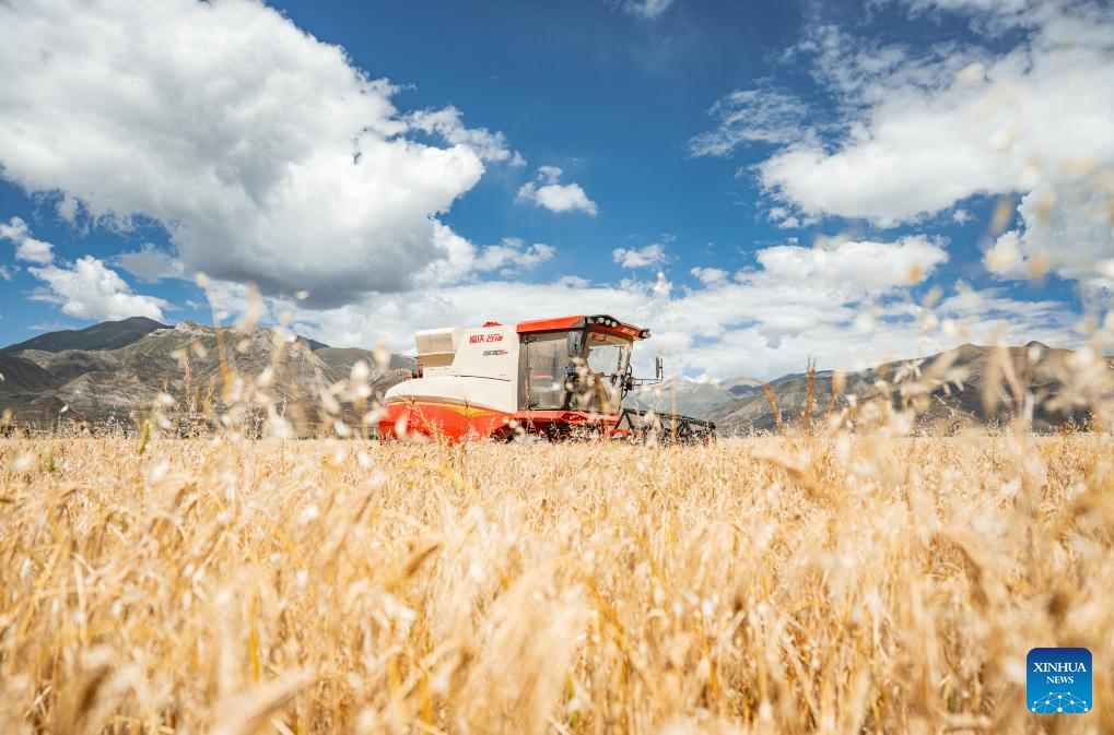 LHASA, 23 septiembre, 2025 (Xinhua) -- Una cosechadora trabaja en un campo de cebada de tierras altas, en el distrito de Lhunzhub, en Lhasa, en la región autónoma de Xizang, en el suroeste de China, el 23 de septiembre de 2025. El festival de la cosecha de los agricultores chinos es el primer festival nacional creado específicamente para los agricultores del país. (Xinhua/Tenzin Nyida)