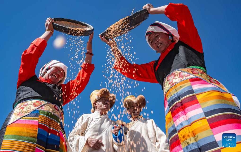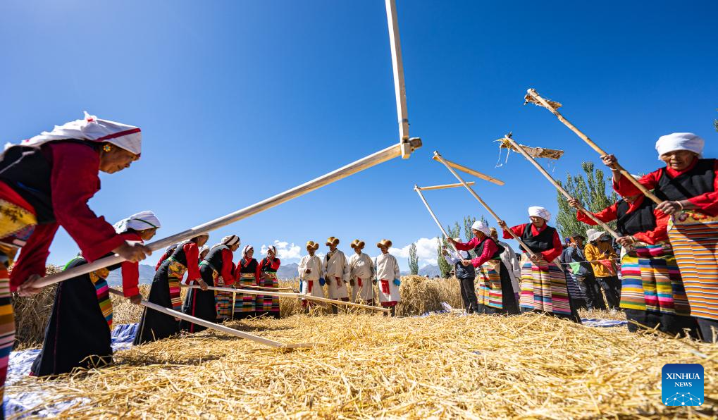LHASA, 23 septiembre, 2025 (Xinhua) -- Agricultores desgranan los cultivos de forma tradicional, en el distrito de Lhunzhub, en Lhasa, en la región autónoma de Xizang, en el suroeste de China, el 23 de septiembre de 2025. El festival de la cosecha de los agricultores chinos es el primer festival nacional creado específicamente para los agricultores del país. (Xinhua/Tenzin Nyida)