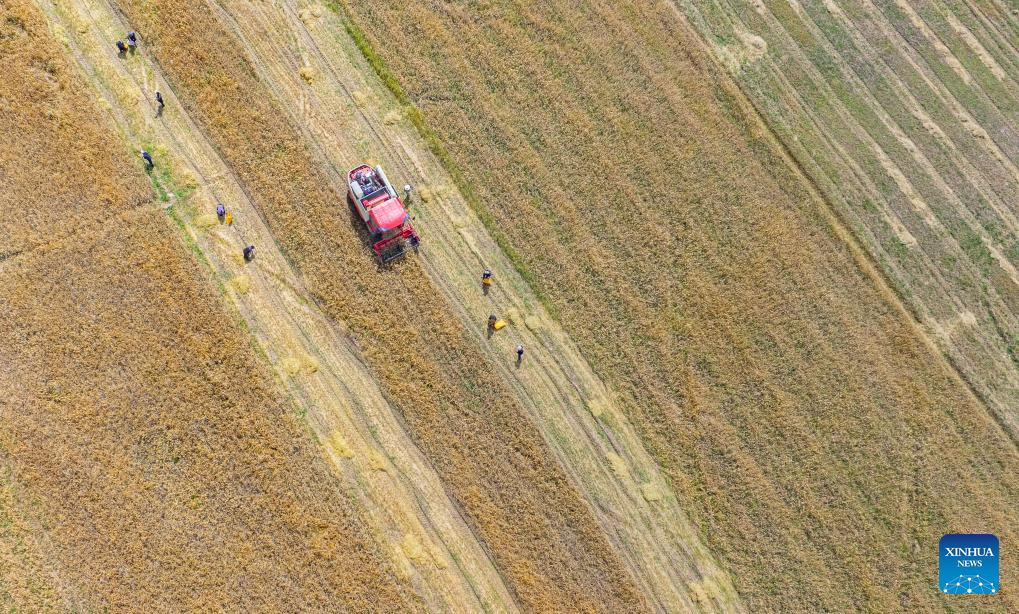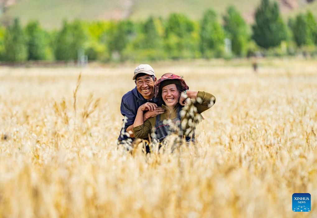 LHASA, 23 septiembre, 2025 (Xinhua) -- Agricultores son vistos en un campo de cebada de tierras altas, en el distrito de Lhunzhub, en Lhasa, en la región autónoma de Xizang, en el suroeste de China, el 23 de septiembre de 2025. El festival de la cosecha de los agricultores chinos es el primer festival nacional creado específicamente para los agricultores del país. (Xinhua/Tenzin Nyida)