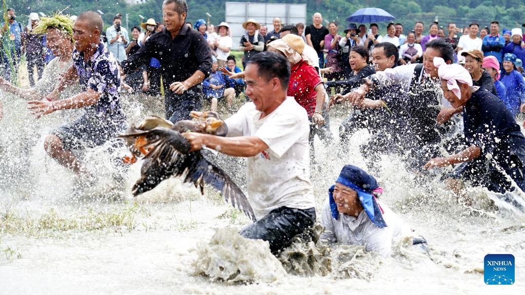 BEIJING, 23 septiembre, 2025 (Xinhua) -- Personas participan en un concurso de caza de patos durante las celebraciones del festival de la cosecha de los agricultores chinos, en el distrito de Rongjiang, en la provincia de Guizhou, en el suroeste de China, el 23 de septiembre de 2025. El festival de la cosecha de los agricultores chinos es el primer festival nacional creado específicamente para los agricultores del país. (Xinhua/Wang Bingzhen)