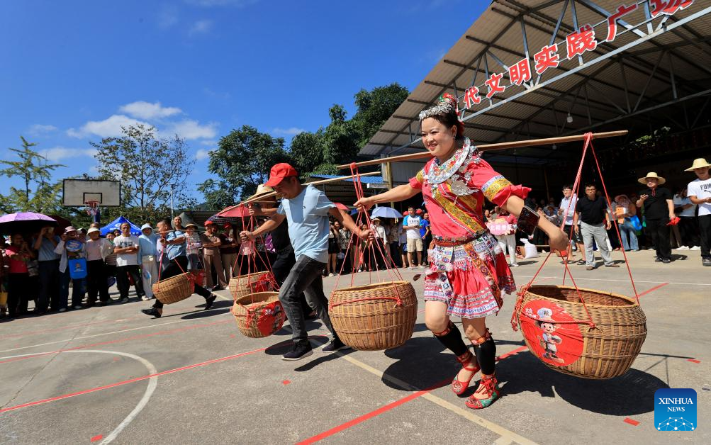 BEIJING, 23 septiembre, 2025 (Xinhua) -- Agricultores participan en una carrera de relevos para transportar arroz durante las celebraciones del festival de la cosecha de los agricultores chinos, en la aldea de Liangbei, en la ciudad de Liuzhou, en la región autónoma de la etnia zhuang de Guangxi, en el sur de China, el 23 de septiembre de 2025. El festival de la cosecha de los agricultores chinos es el primer festival nacional creado específicamente para los agricultores del país. (Xinhua/Tan Kexing)