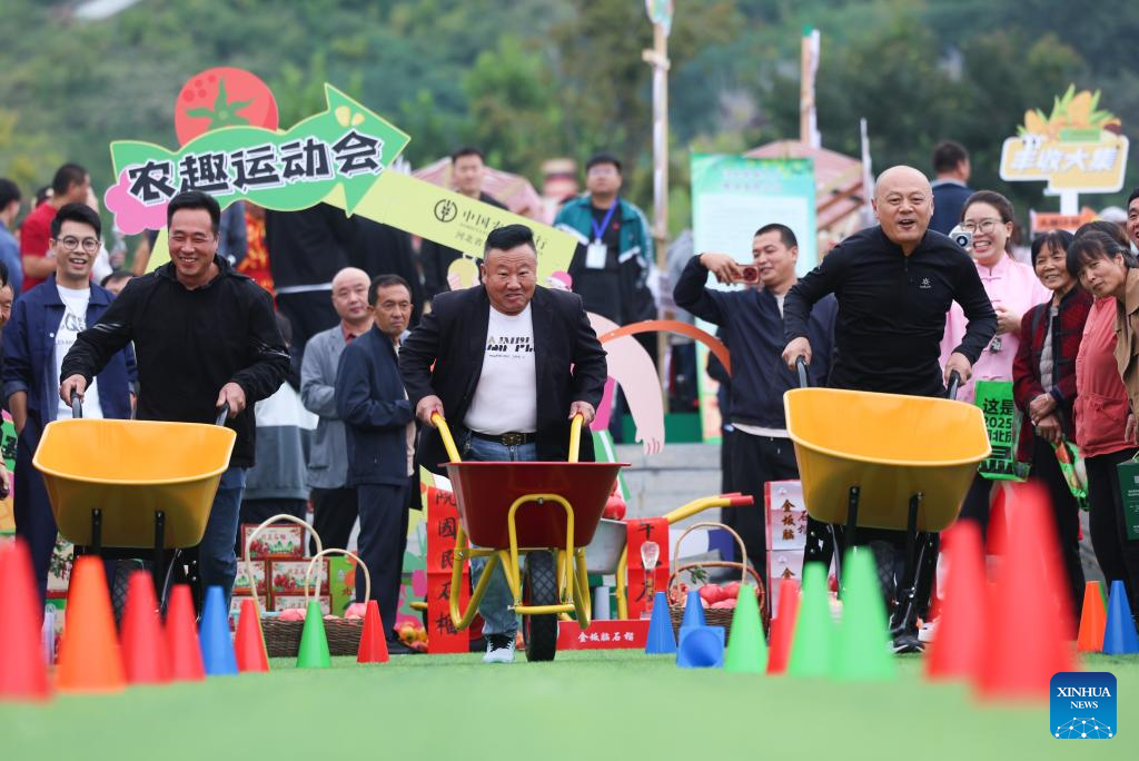 BEIJING, 23 septiembre, 2025 (Xinhua) -- Personas participan en un divertido evento deportivo para agricultores durante las celebraciones del festival de la cosecha de los agricultores chinos, en el distrito de Yuanshi, en la provincia de Hebei, en el norte de China, el 23 de septiembre de 2025. El festival de la cosecha de los agricultores chinos es el primer festival nacional creado específicamente para los agricultores del país. (Xinhua/Liang Zidong)