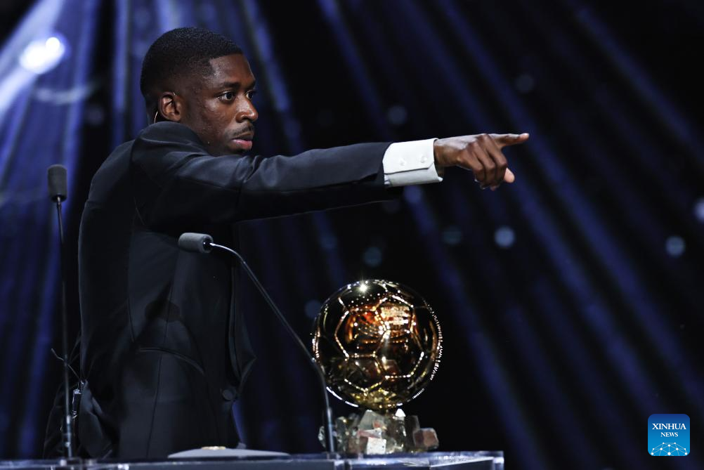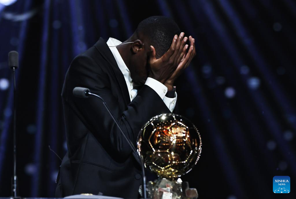 PARIS, 23 septiembre, 2025 (Xinhua) -- Imagen del 22 de septiembre de 2025 del jugador francés de Paris Saint-Germain, Ousmane Dembele, reaccionando después de ganar el Balón de Oro masculino durante la ceremonia de premiación del Balón de Oro 2025 de France Football en el Teatro del Chatelet, en París, Francia. (Xinhua/Gao Jing)