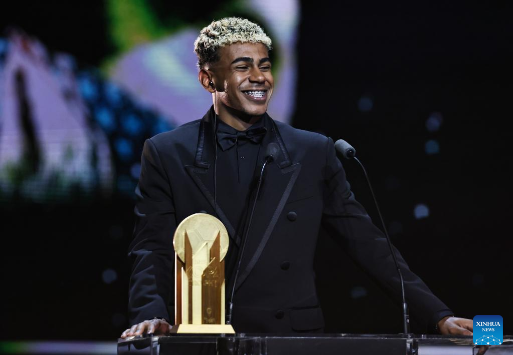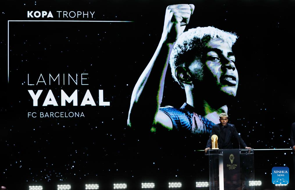 PARIS, 23 septiembre, 2025 (Xinhua) -- Imagen del 22 de septiembre de 2025 del jugador español de Barcelona, Lamine Yamal, hablando después de recibir el Trofeo Kopa al mejor jugador menor de 21 años durante la ceremonia de premiación del Balón de Oro 2025 de France Football en el Teatro del Chatelet, en París, Francia. (Xinhua/Gao Jing)
