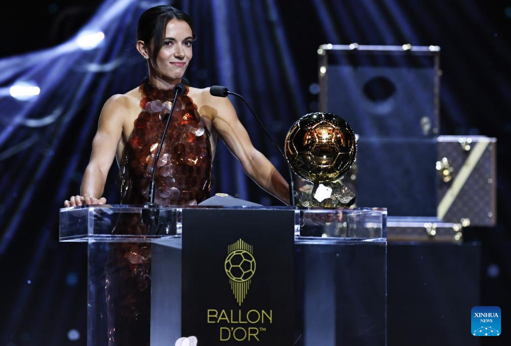 PARIS, 23 septiembre, 2025 (Xinhua) -- Imagen del 22 de septiembre de 2025 de la centrocampista española de Barcelona, Aitana Bonmati, hablando en el escenario mientras recibe el premio Balón de Oro Femenino durante la ceremonia de premiación del Balón de Oro 2025 de France Football en el Teatro del Chatelet, en París, Francia. (Xinhua/Gao Jing)
