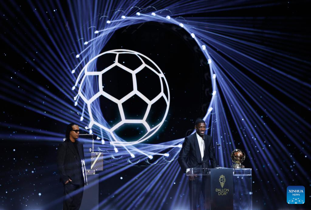 PARIS, 23 septiembre, 2025 (Xinhua) -- Imagen del 22 de septiembre de 2025 del jugador francés de Paris Saint-Germain, Ousmane Dembele (d), hablando después de ganar el Balón de Oro masculino durante la ceremonia de premiación del Balón de Oro 2025 de France Football en el Teatro del Chatelet, en París, Francia. (Xinhua/Gao Jing)