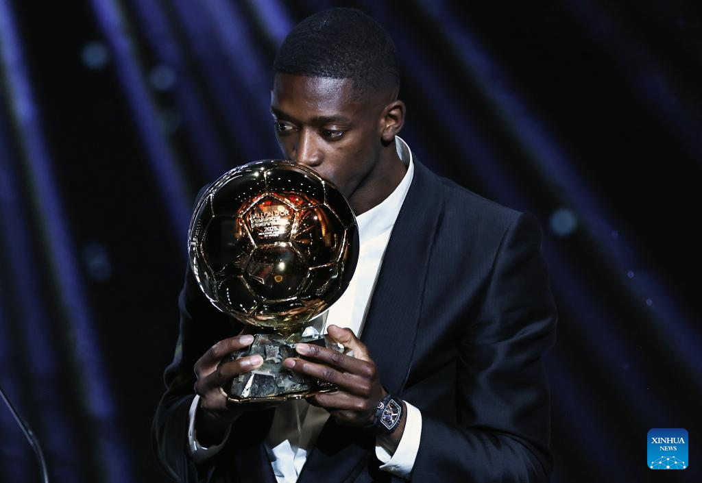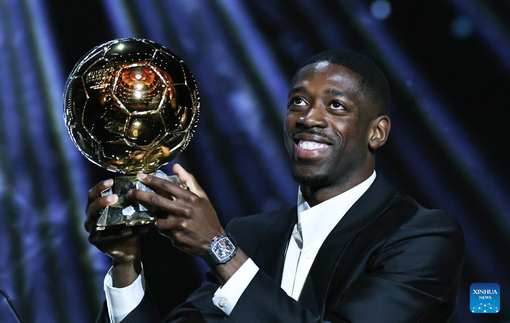 PARIS, 23 septiembre, 2025 (Xinhua) -- Imagen del 22 de septiembre de 2025 del jugador francés de Paris Saint-Germain, Ousmane Dembele, posando con su trofeo durante la ceremonia de premiación del Balón de Oro 2025 de France Football en el Teatro del Chatelet, en París, Francia. (Xinhua/Gao Jing)