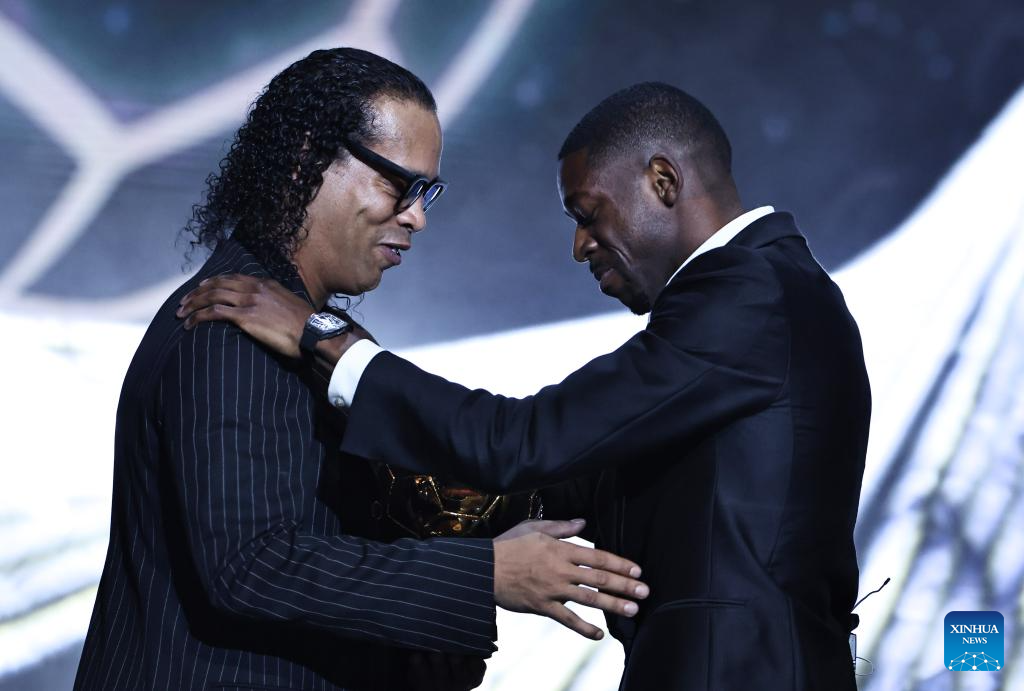 PARIS, 23 septiembre, 2025 (Xinhua) -- Imagen del 22 de septiembre de 2025 del jugador francés de Paris Saint-Germain, Ousmane Dembele (d), recibiendo el Balón de Oro de manos del exfutbolista brasileño, Ronaldinho, durante la ceremonia de premiación del Balón de Oro 2025 de France Football en el Teatro del Chatelet, en París, Francia. (Xinhua/Gao Jing)