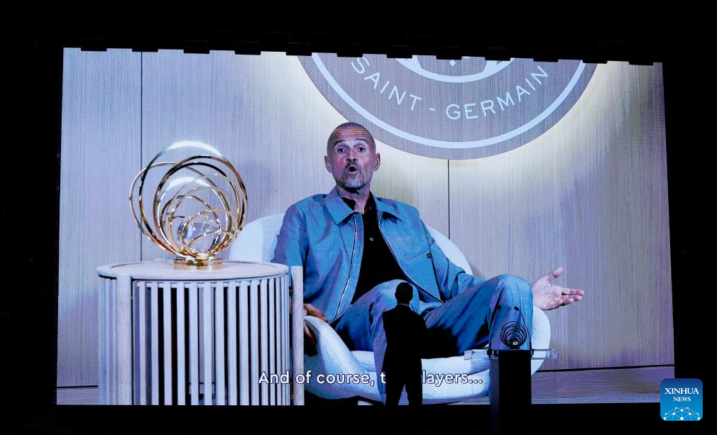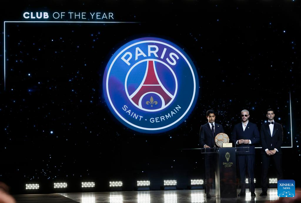 PARIS, 23 septiembre, 2025 (Xinhua) -- Imagen del 22 de septiembre de 2025 del presidente qatarí de París Saint Germain, Nasser al-Khelaifi (i), pronuncia un discurso después de ganar el premio al mejor equipo masculino de fútbol del año durante la ceremonia de premiación del Balón de Oro 2025 de France Football en el Teatro del Chatelet, en París, Francia. (Xinhua/Gao Jing)