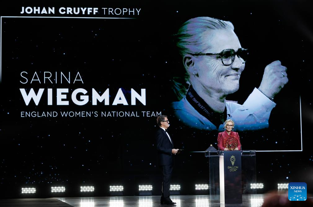 PARIS, 23 septiembre, 2025 (Xinhua) -- Imagen del 22 de septiembre de 2025 de la directora técnica neerlandesa de Inglaterra, Sarina Wiegman (d), pronuncia un discurso tras ganar el premio Johan Cruyff al mejor director técnico de un equipo femenino durante la ceremonia de premiación del Balón de Oro 2025 de France Football en el Teatro del Chatelet, en París, Francia. (Xinhua/Gao Jing)