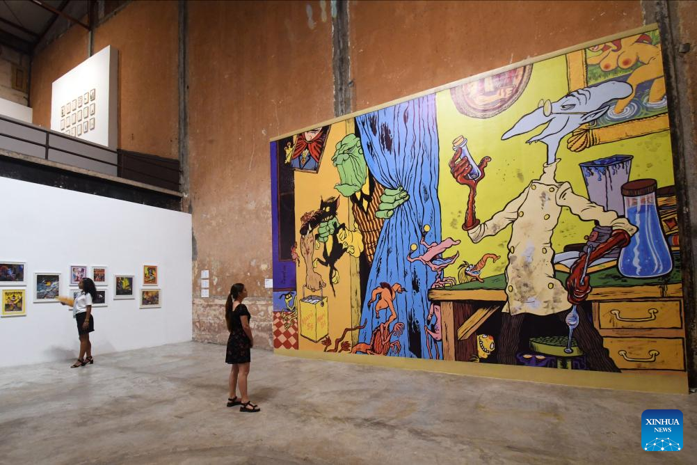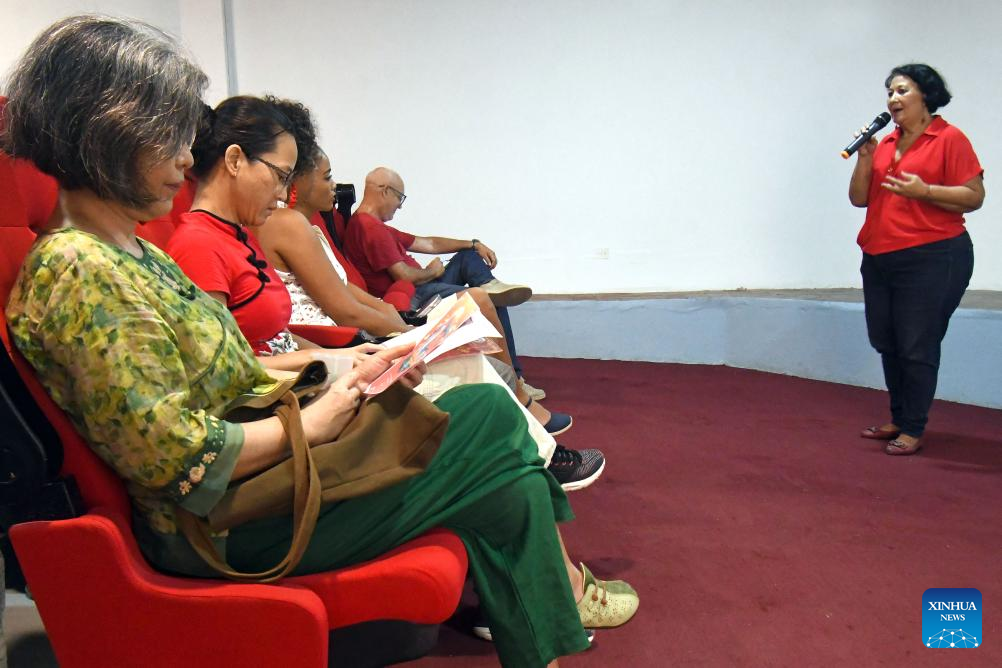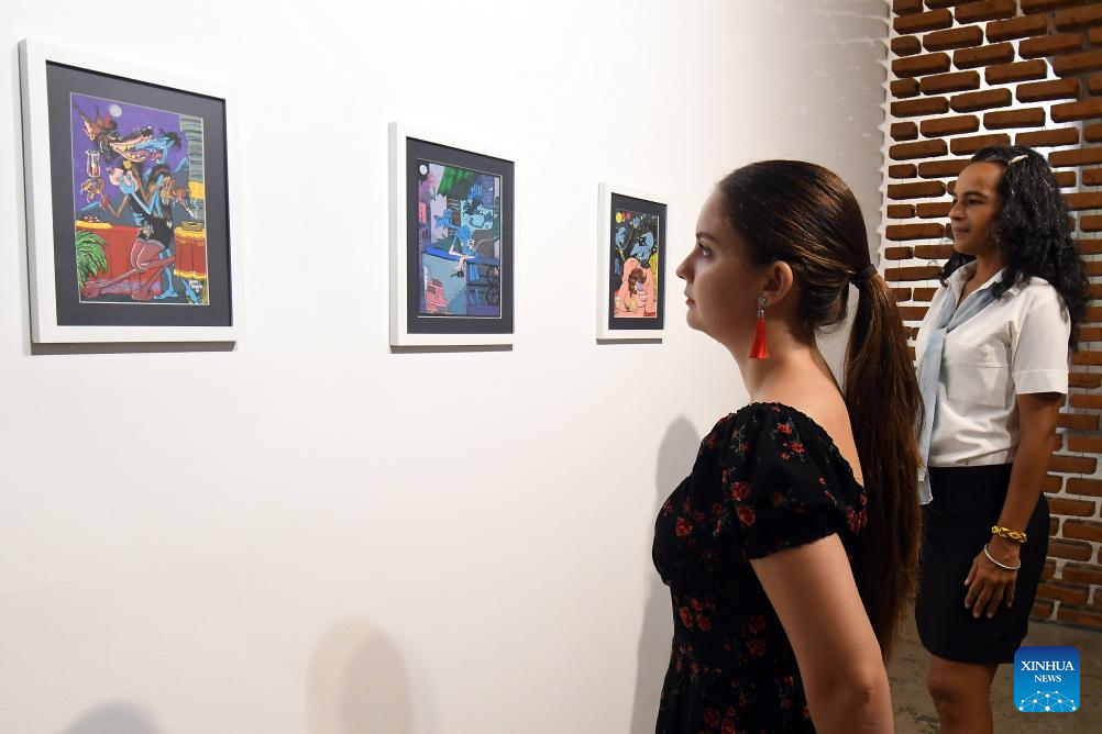 Mujeres observan pinturas realizadas por el cineasta y pintor cubano, Juan Padrón, exhibidas en una galería en el marco de la celebración del 65º aniversario del establecimiento de relaciones diplomáticas entre China y Cuba, en el Barrio Chino de la Habana, en La Habana, capital de Cuba, el 24 de septiembre de 2025. Con un programa de actividades académicas y culturales, el Barrio Chino de La Habana celebra el 65º aniversario del establecimiento de relaciones diplomáticas entre China y Cuba. (Xinhua/Joaquín Hernández)